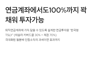 이 ETF는 TSLY 같은 상품을 퇴직연금계좌에서 담을 수 없을까 라는 고민에서 시작하였고, 실제로 연금계좌에서 투자할 수 있도록 설계가 된 상품입니다.