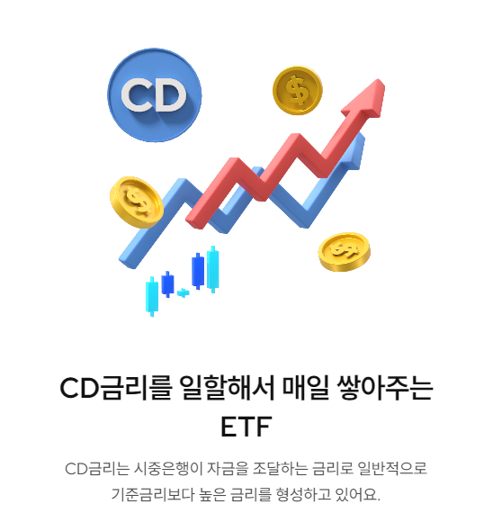 쉽고 저렴하게 운용할 수 있는 ETF로 고금리 시기에 단기 현금 운용에 유리하며 또한, 매일 CD금리에 따라 일할 이자가 확정되어 원금에 가산되므로 이자가 일 복리로 쌓이고, 이 CD금리에 ETF로 투자하기 때문에 쉽게 현금화가 가능합니다.